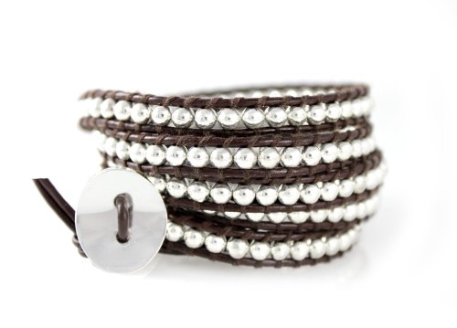 This stunning wrap bracelet "Dakota" has 34 inches of silver-plated metal beads (not plastic) woven onto brown leather; overall length is 38 inches. Three loops and a silver tone oval button make this bracelet fully adjustable. Fabulous, contemporary style. Wraps most wrists 5 to 6 times. Arrives prettily dressed in a silver gift box with silver bow, ready for giving as a gift (to someone else... or to yourself!).Available at Amazon Check Price Now!
