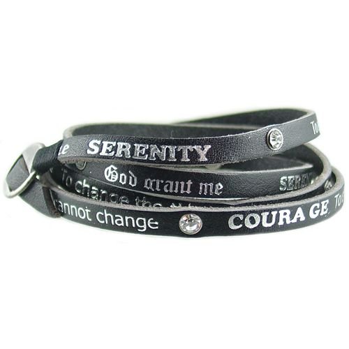 This black leather wrap bracelet is imprinted with the Serenity Prayer in silver lettering and accented with clear crystal studs. The overall length is 36" and the bracelet will wrap around your wrist 4 - 5 times, depending upon the size of your wrist and how tight you like it. The disk buckle makes it infinitely adjustable. The bracelet reads "God grant me SERENITY to accept the things I cannot change COURAGE to change the things I can and WISDOM to know the difference." The perfect anniversary gift for anyone in recovery.Available at Amazon Check Price Now!